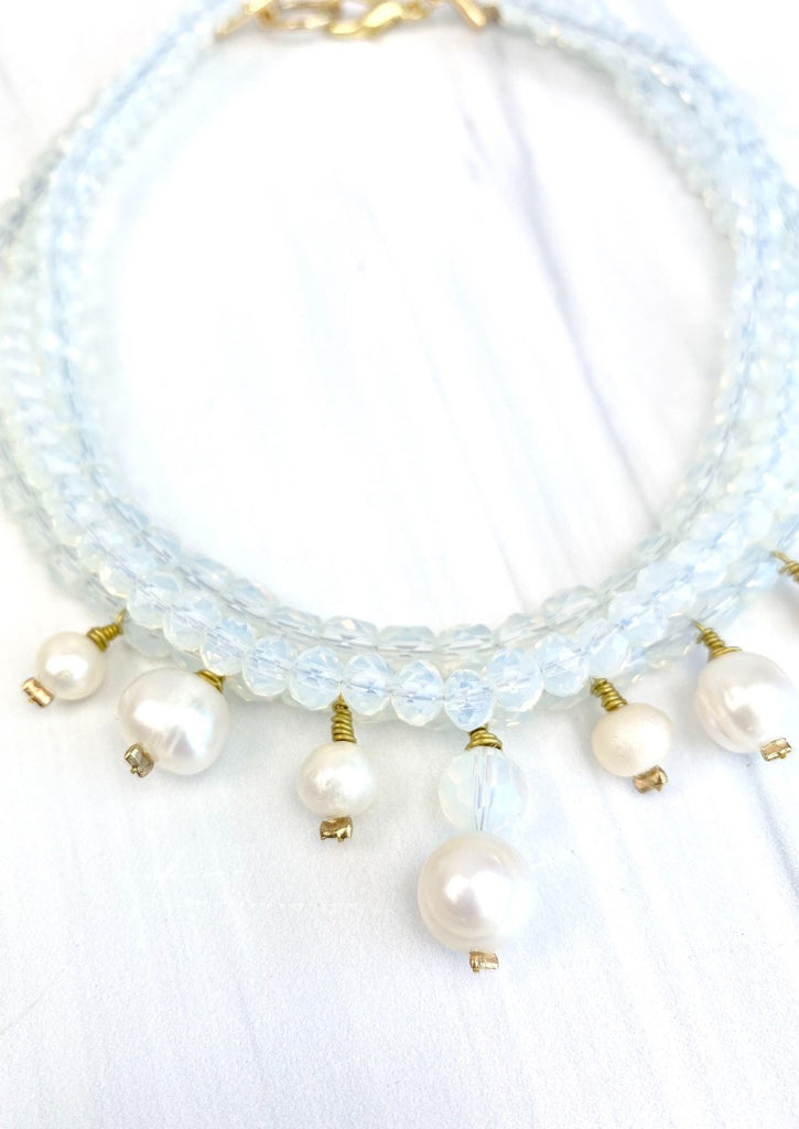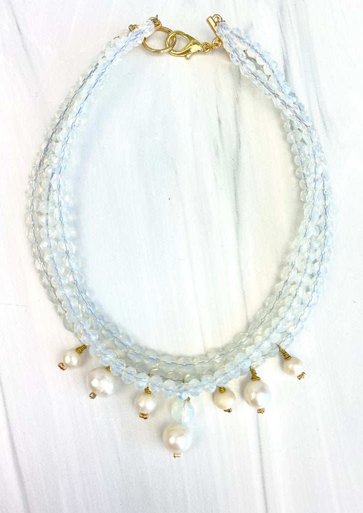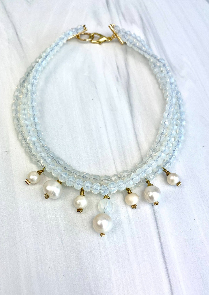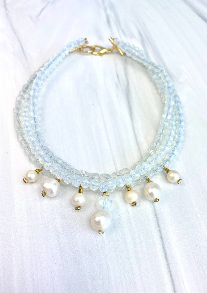 Triple Multi strand Faceted Moonstone Choker with Dangling Natural Pearls Hand wrapped Joel Handmade. A beautiful extremely sparkly necklace to wear alone or layer with a lariat. It has a transparent milky white perfect to match with any color.