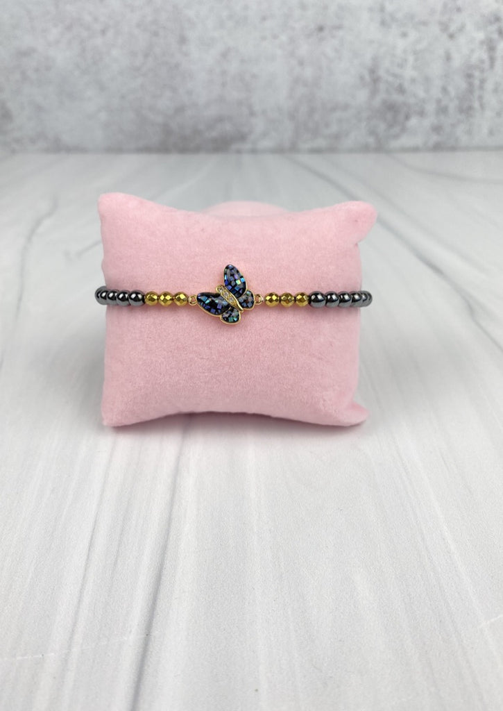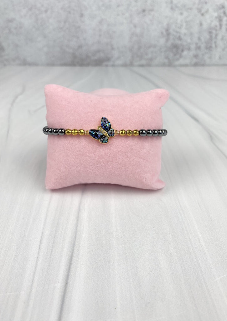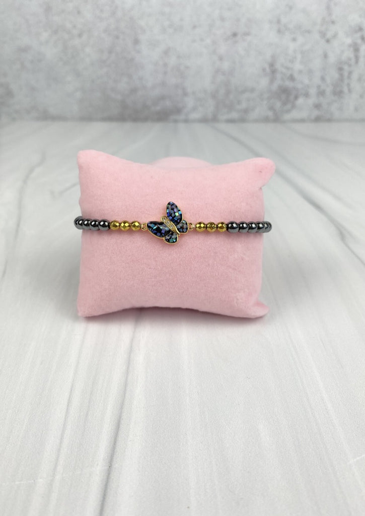 Butterfly with CZ Cubic Zirconia and Mother of Pearl Elastic Bracelet with Hematite Beads Joel Handmade