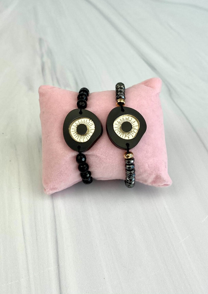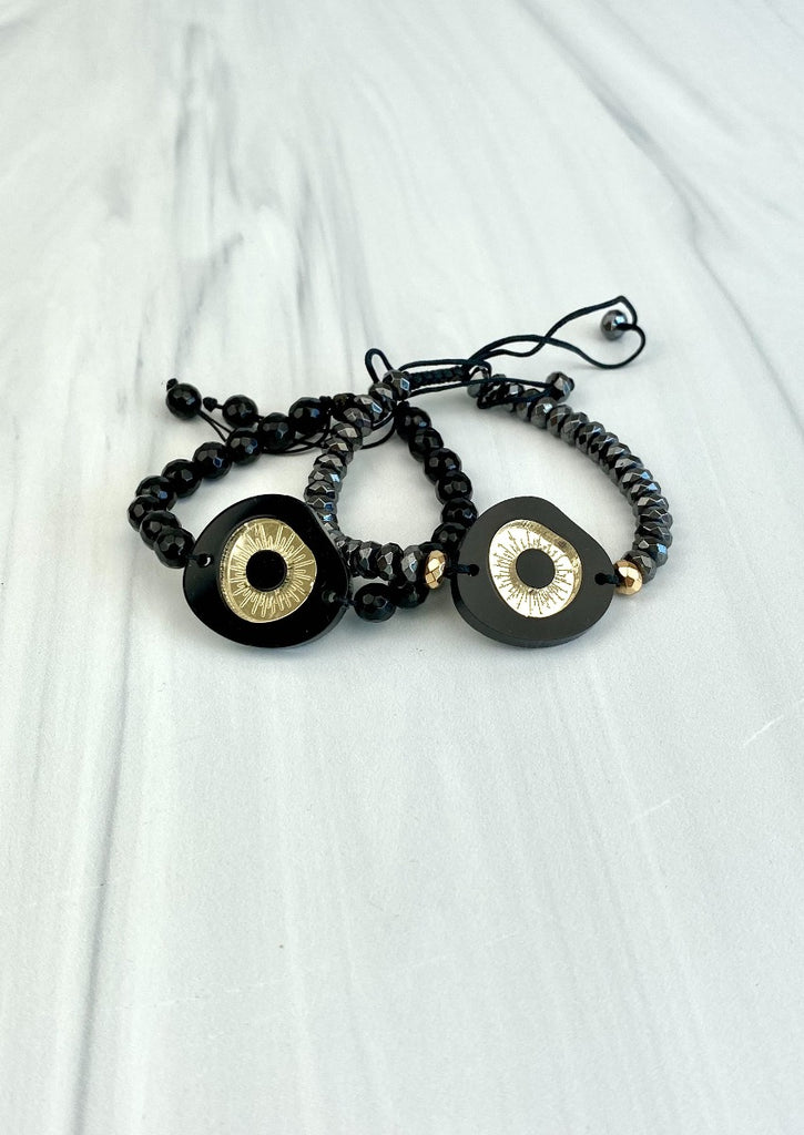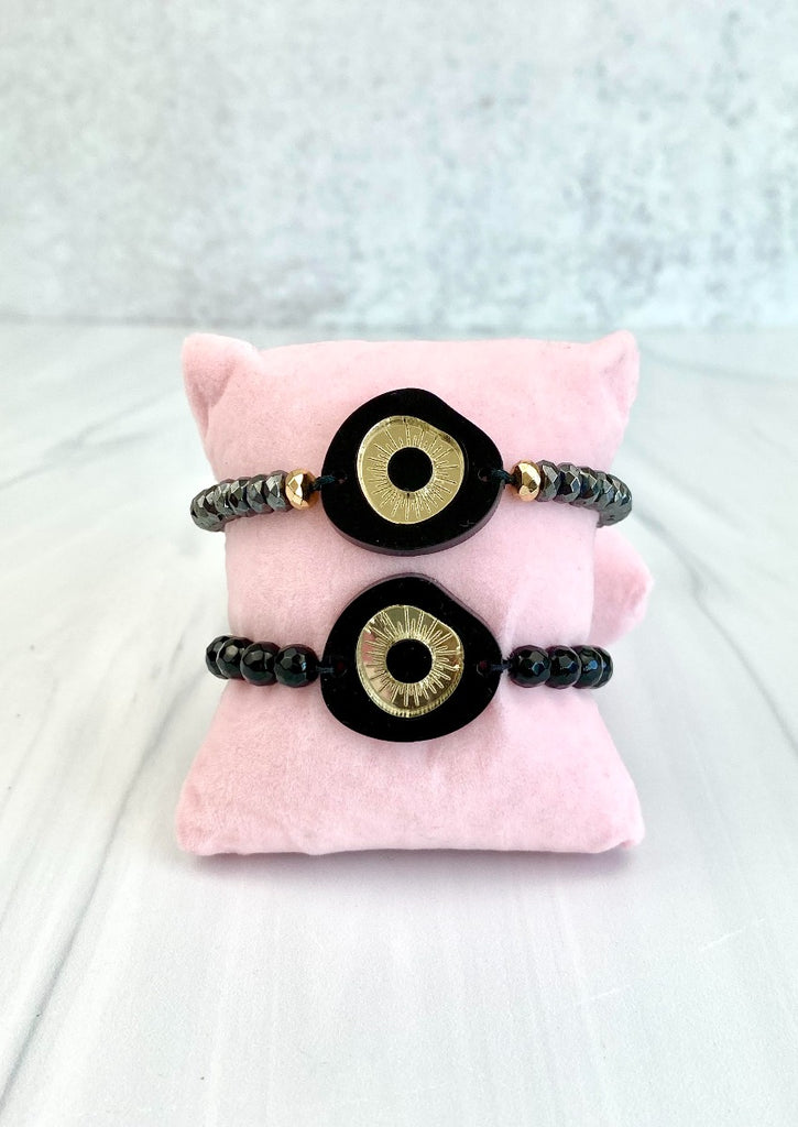 Evil Eye Acrylic Gold & Black Featuring Sparkly Hematites and Faceted Black Agate Adjustable