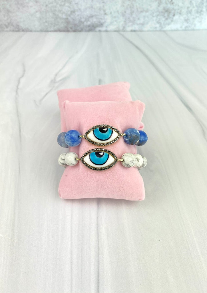 EVILEYE EVIL EYE PAINTED PORCELAIN BLUE WITH GEMSTONE BEADS HOWLITE, MARBLE, FACETED AGATE ADJUSTABLE BRACELET JOEL HANDMADE
