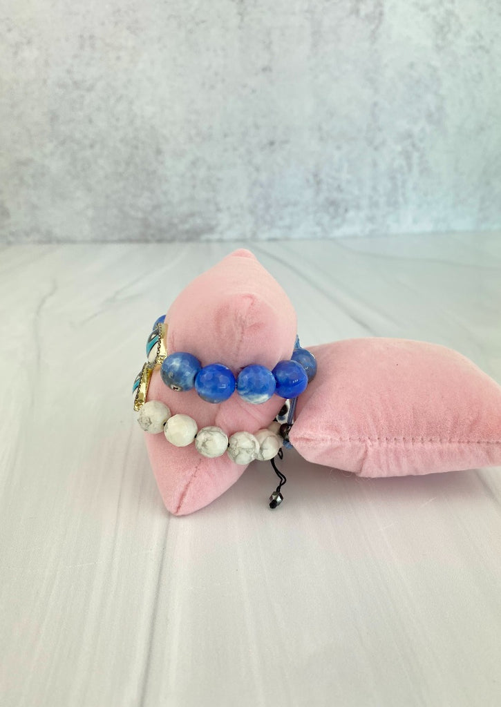 Bead size: 10mm Blue Agate and 8mm White Howlite