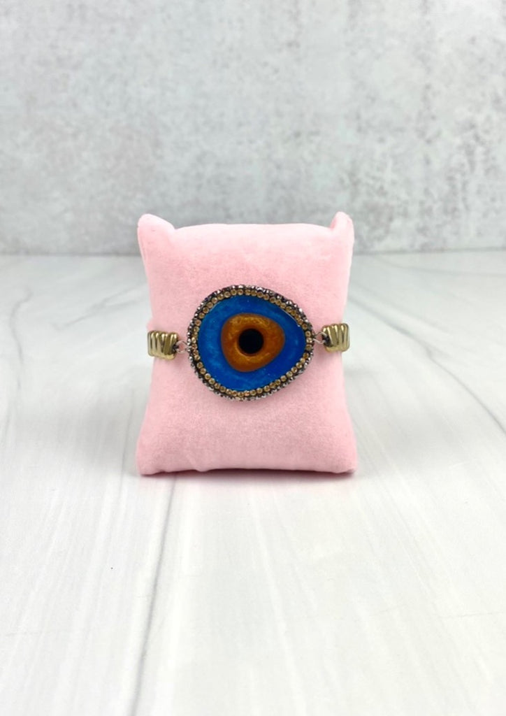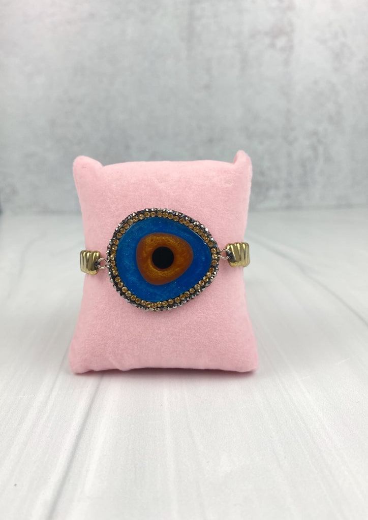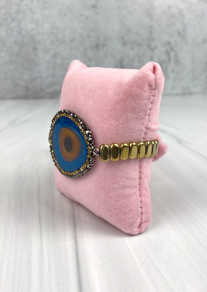 Evileye Glass Blue Brown Motif w Crystals Adjustable bracelet with Long Olive Gold Hematites Beads Joel Handmade