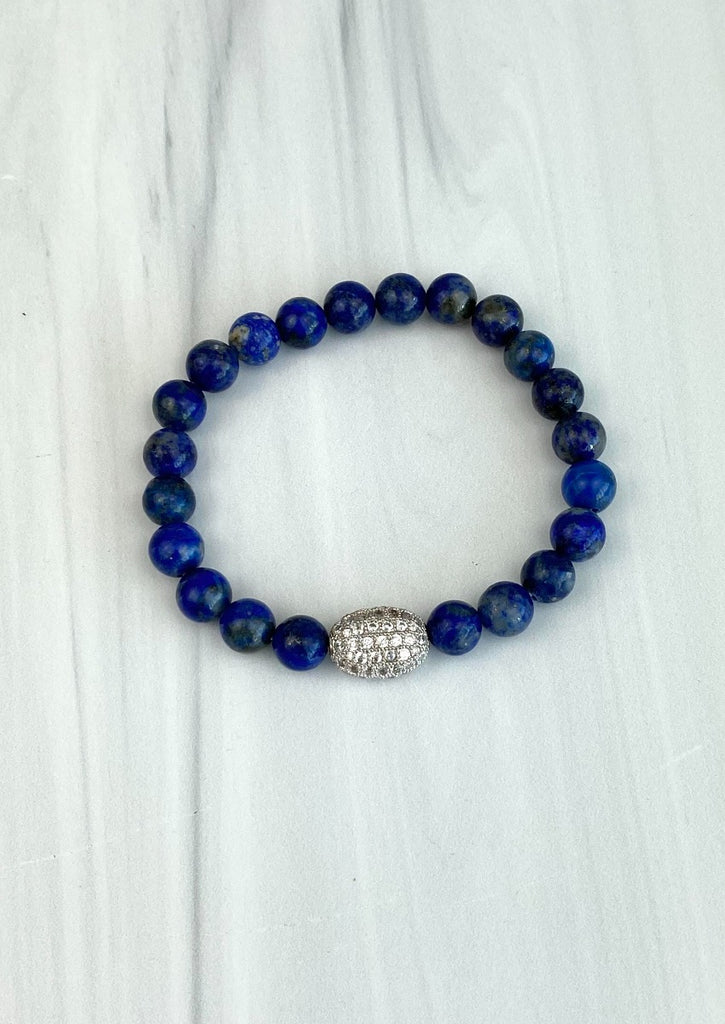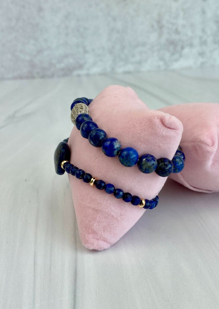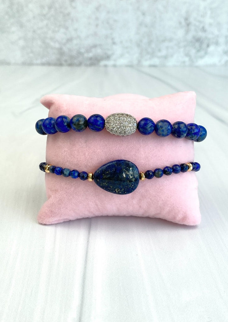- The wider bracelet is made of 7mm Lapis Lazuli beads and a central brass Gold Platted with pave Cubic Zirconia bead.