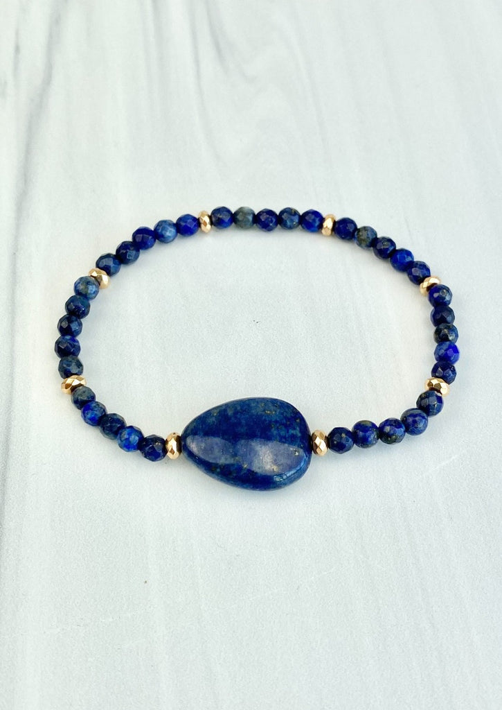 Lapis Lazuli with Gold Flakes Inclusions Elastic Bracelet Dainty CZ large bead Joel Handmade