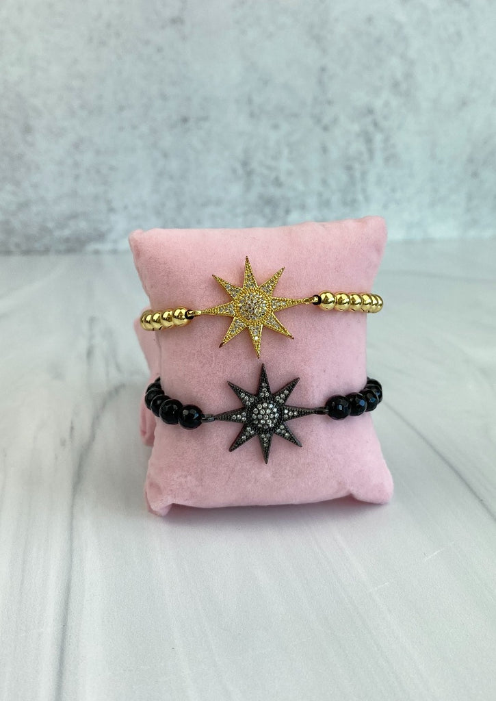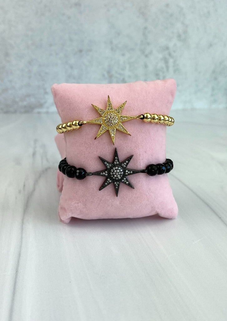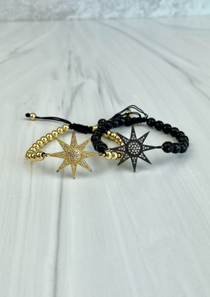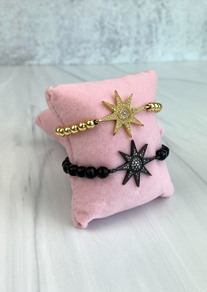 Starburst Adjustable Gold Bracelet with CZ Cubic Zirconia Black Faceted Onyx