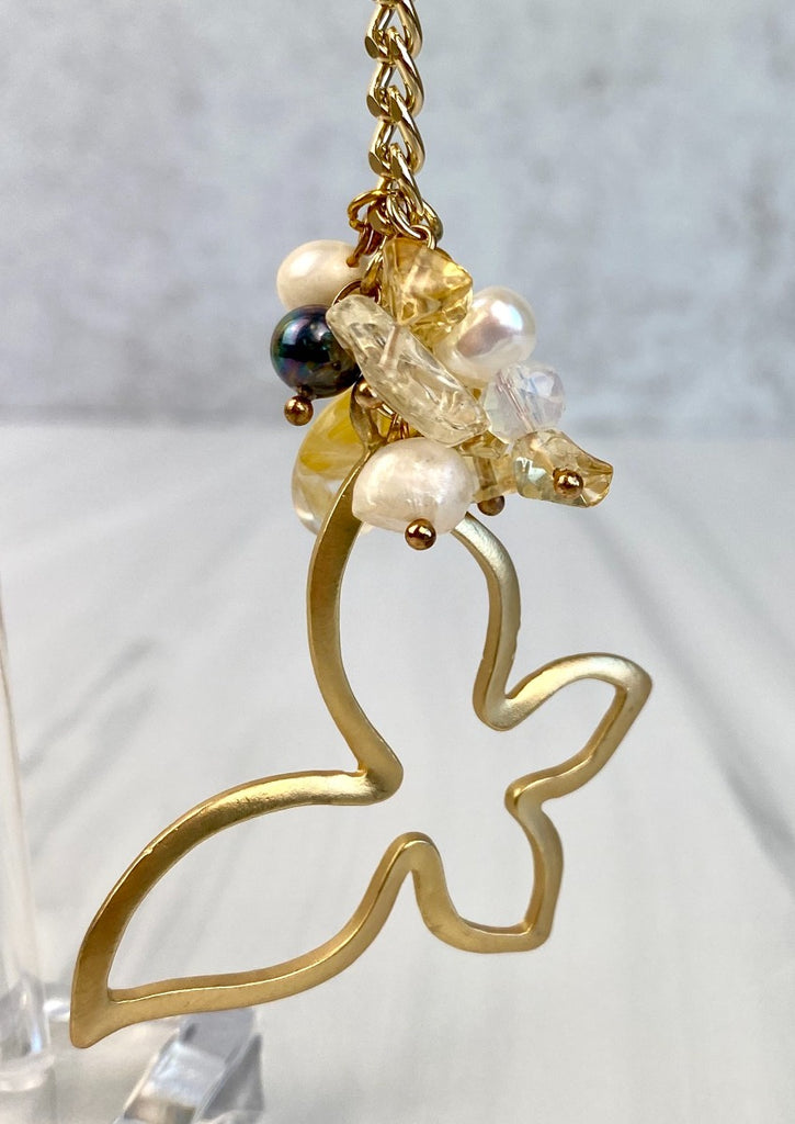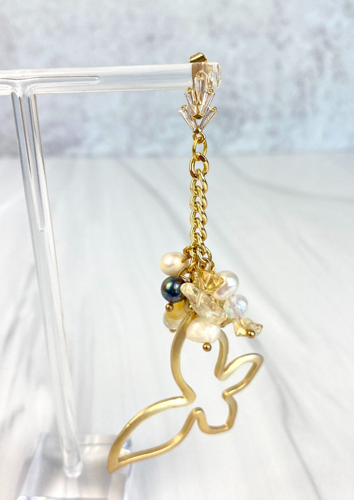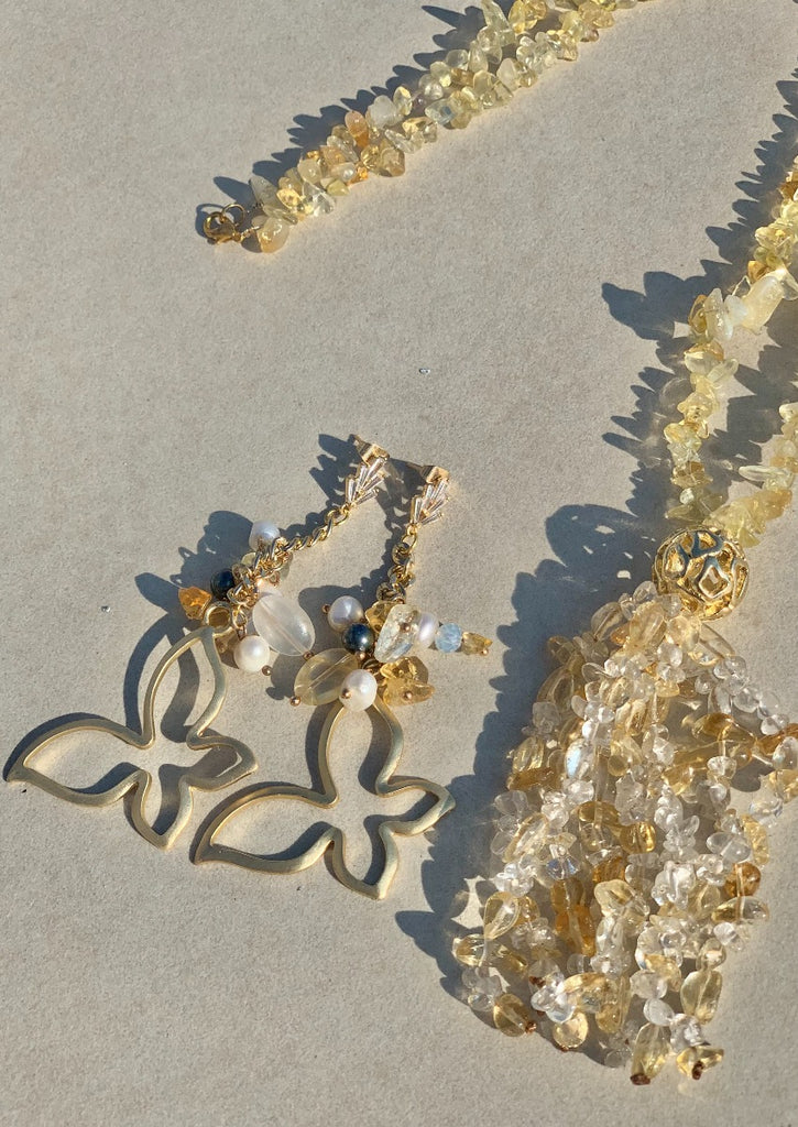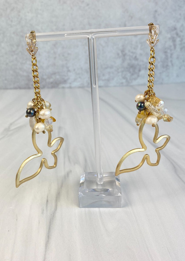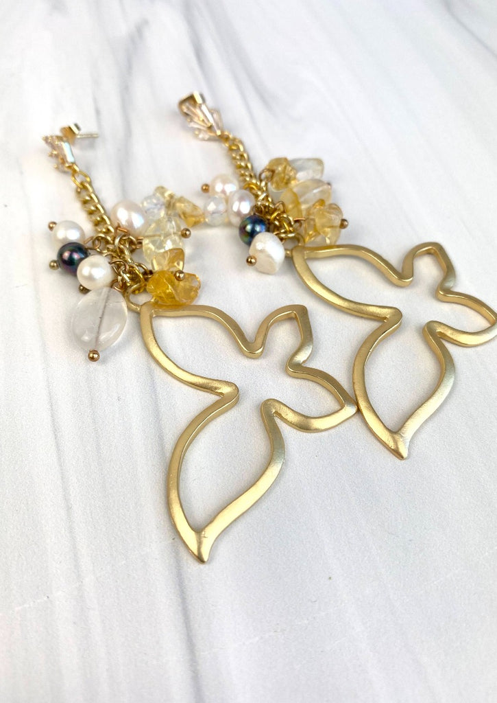 Gold Butterfly Statement Dangling Earrings with Cubic Zirconia Natural Pearls Citrine Quartz Joel Handmade