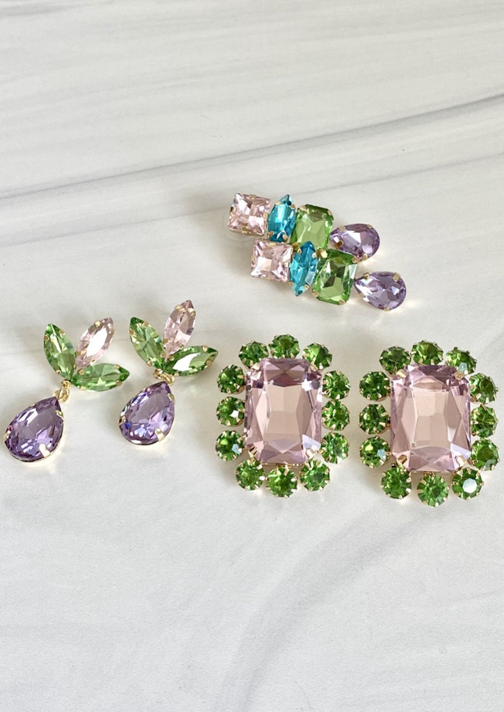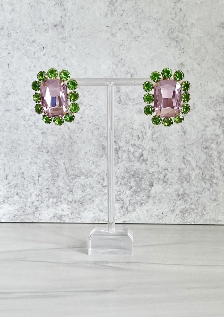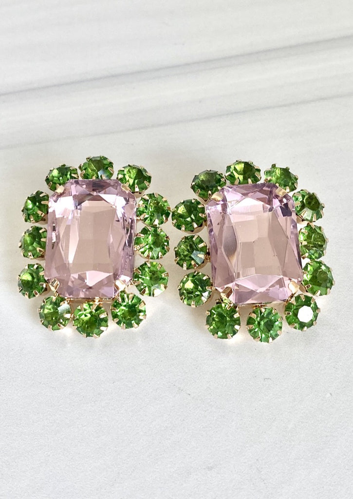 Oversized Rectangular Button Glass Earrings Pastel Pink Green Sparkly, JoEl handmade