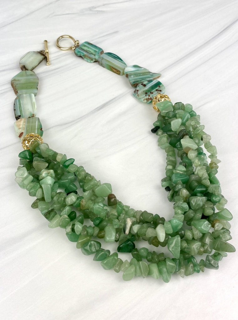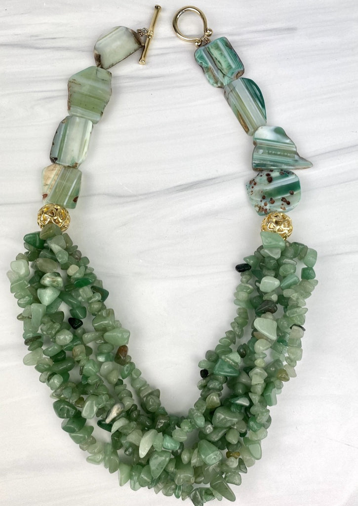 Beautiful multi strand statement necklace with Aventurine chip beads and agate slab beads.Featuring two Large brass 14K gold platted Beads and an oversized Brass 14K Gold Plated Toggle clasp.