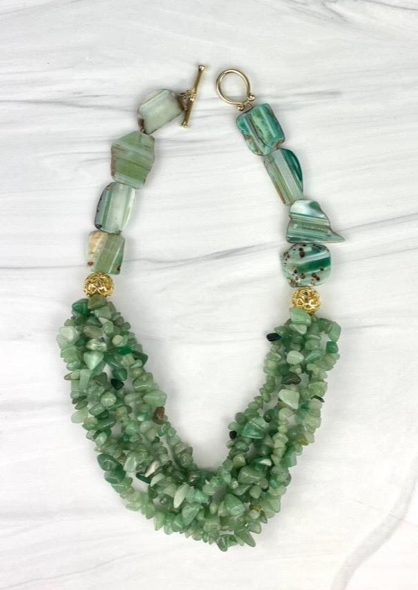Green Aventurine and Agate Chunky Statement Necklace Multi strand Large clasp Joel handmade