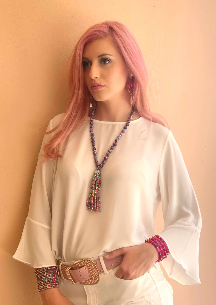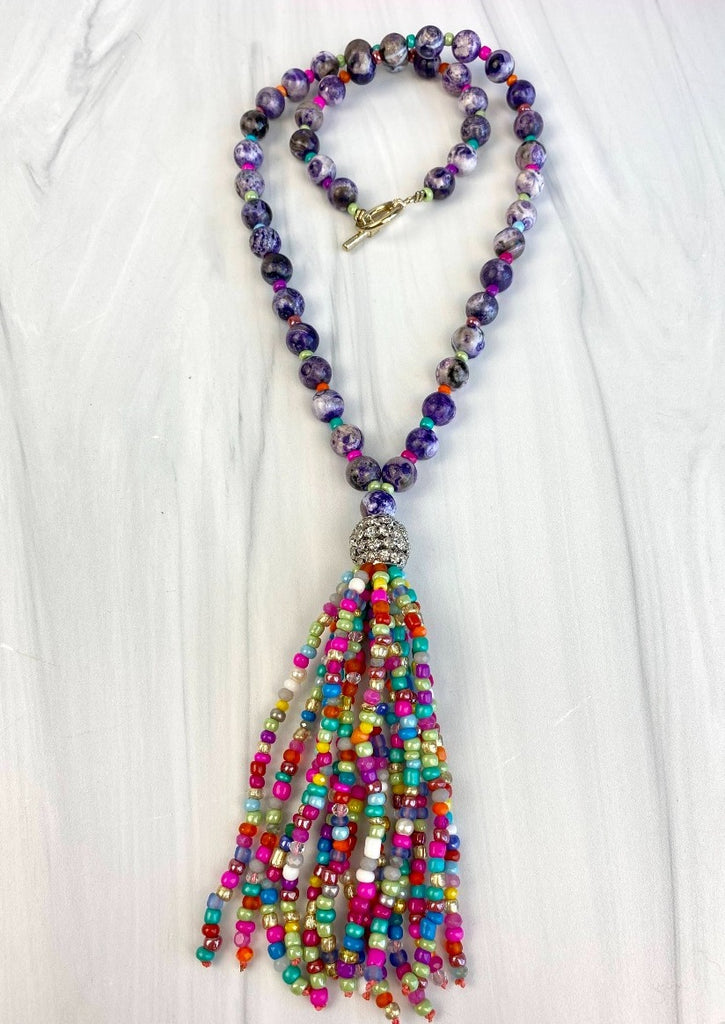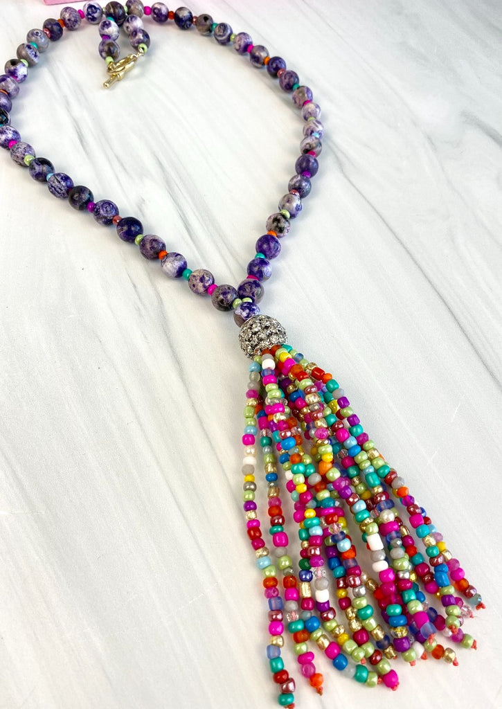 Candy Collection Necklace with Bright Whimsical Colors Purple Agate Gemstone and Multicolor Tassel with Seed Beads Joel Handmade