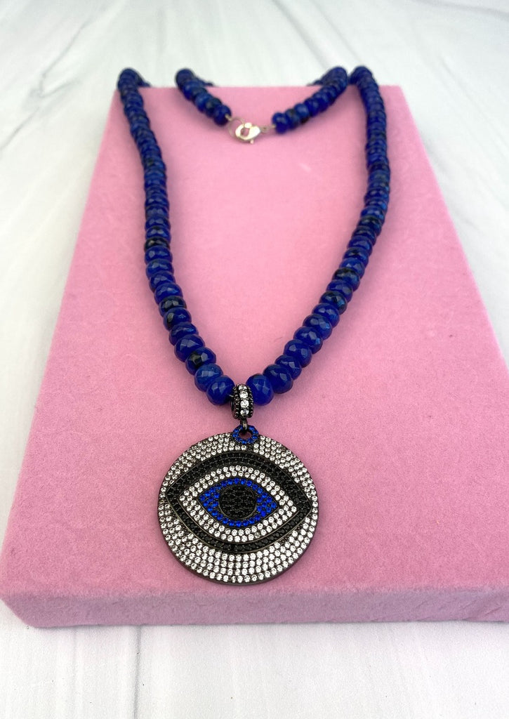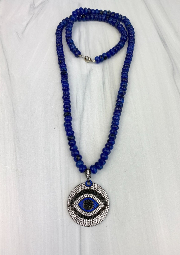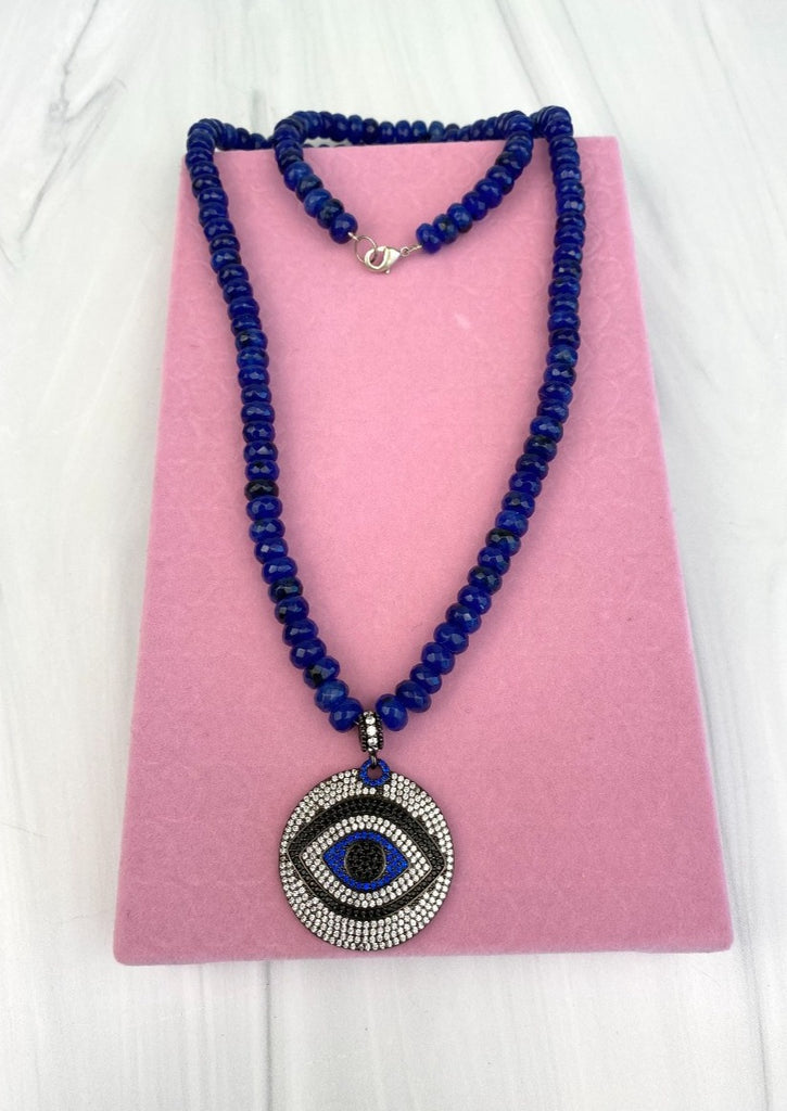 Cobalt Blue Evil Eye CZ Pendant Necklace with Faceted Rondelle Nephrite Joel Handmade