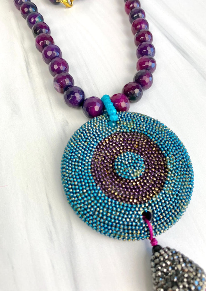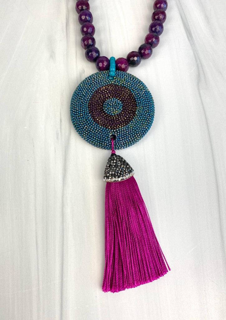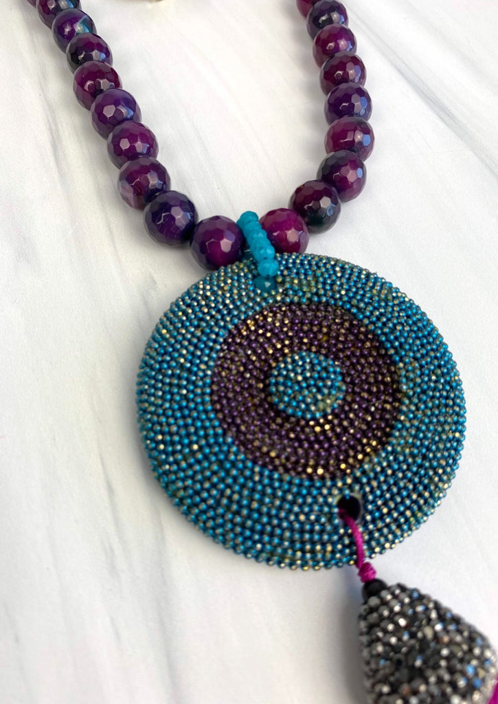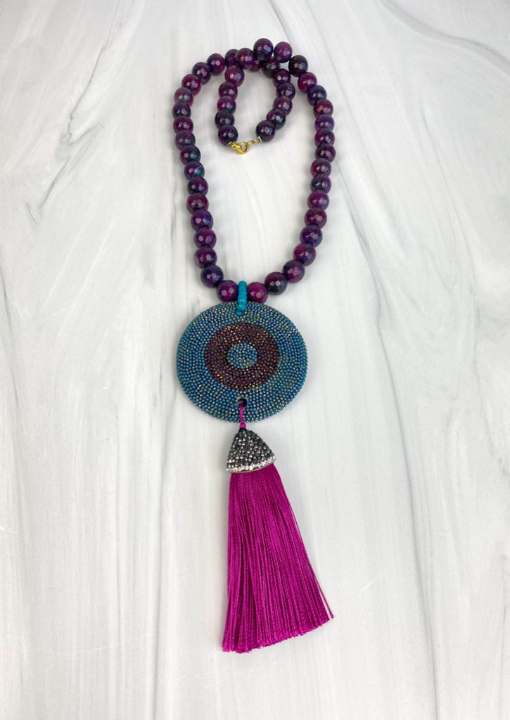 Evileye Long Necklace Purple Faceted Gemstones and Teal Nephrite and Silk Fringe Joel Handmade