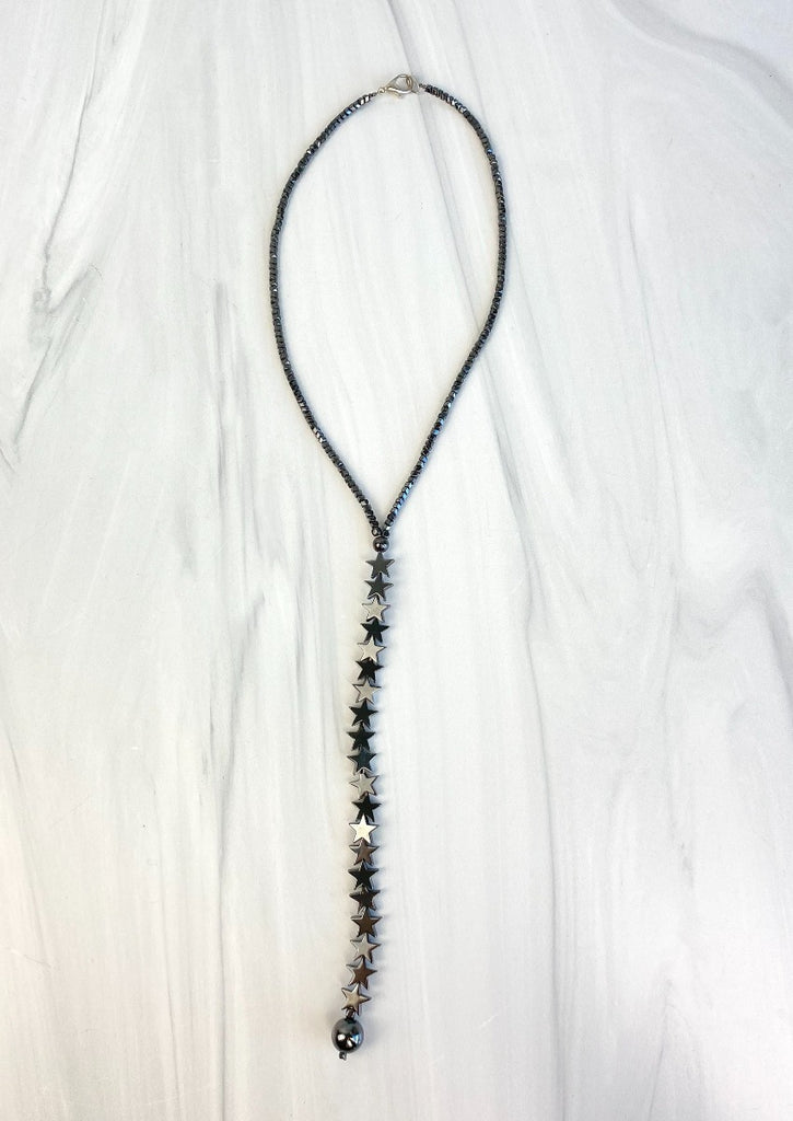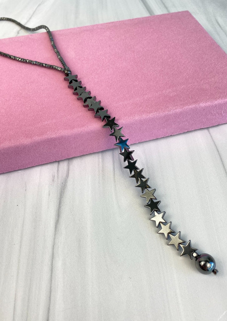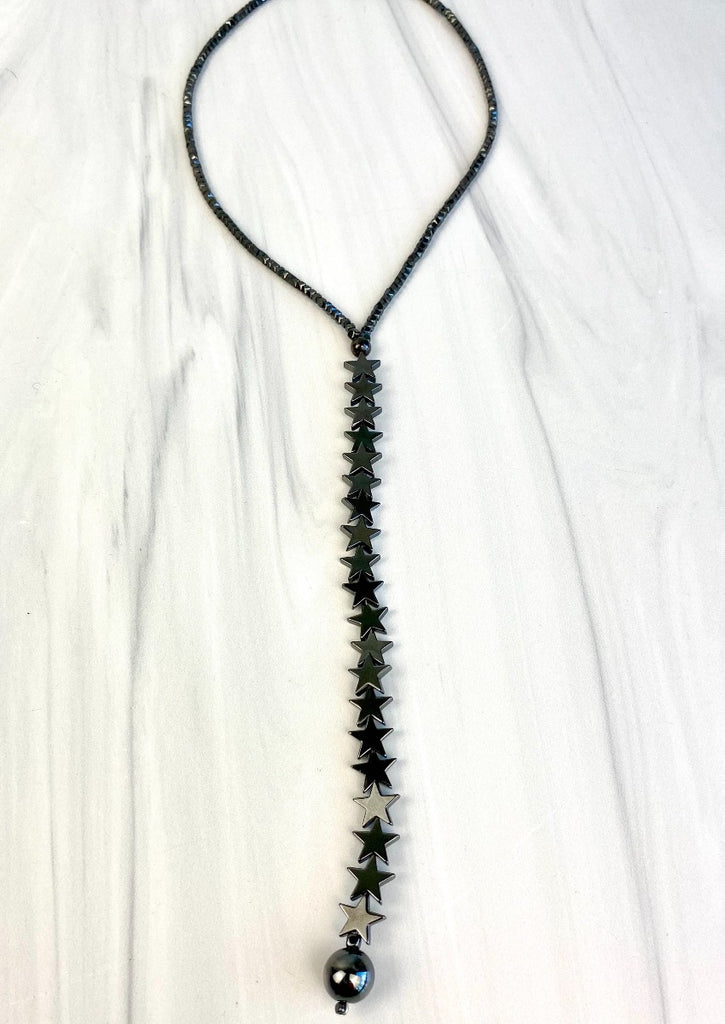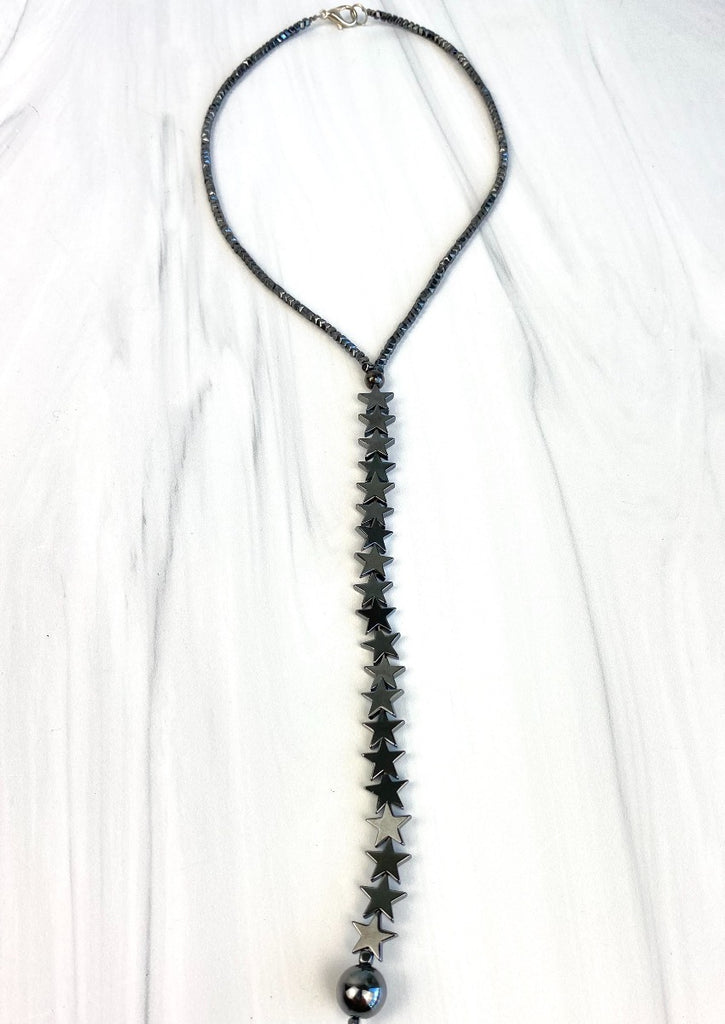 Hematite Lariat Necklace with Stars Metallic Grey Sparkly Joel Handmade