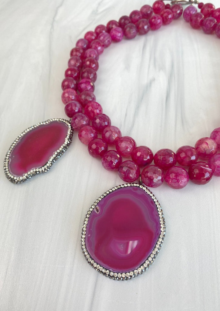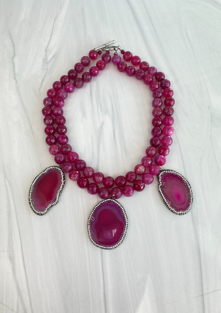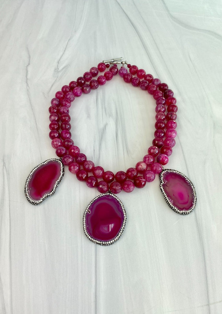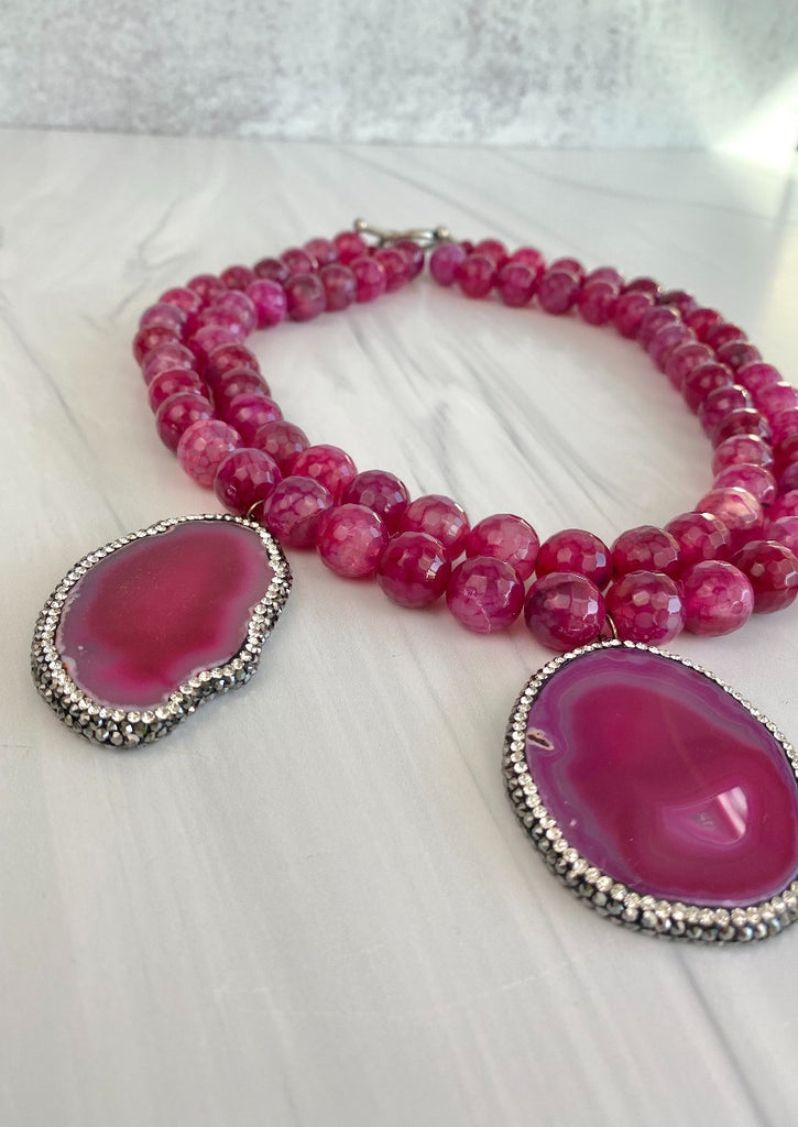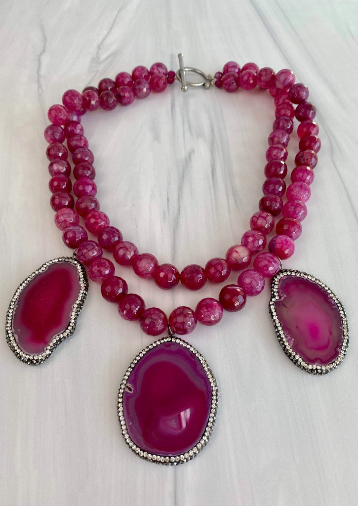 Statement Bespoke Necklace Large Agate Slabs Pendant Hot Pink Fuchsia Oversized Faceted Agate Beads with Crystals Joel Handmade