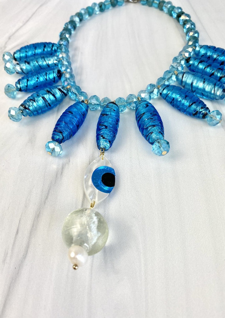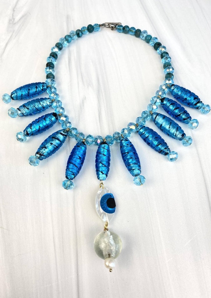 One of a kind, whimsical statement necklace featuring an acrylic white blue evil eye, Faceted Czech Crystals and dangling art Glass fringed around the Neck in a vibrant blue.