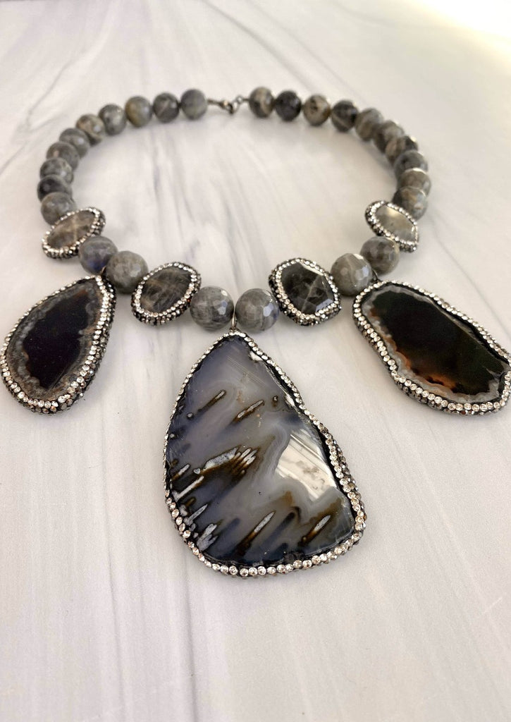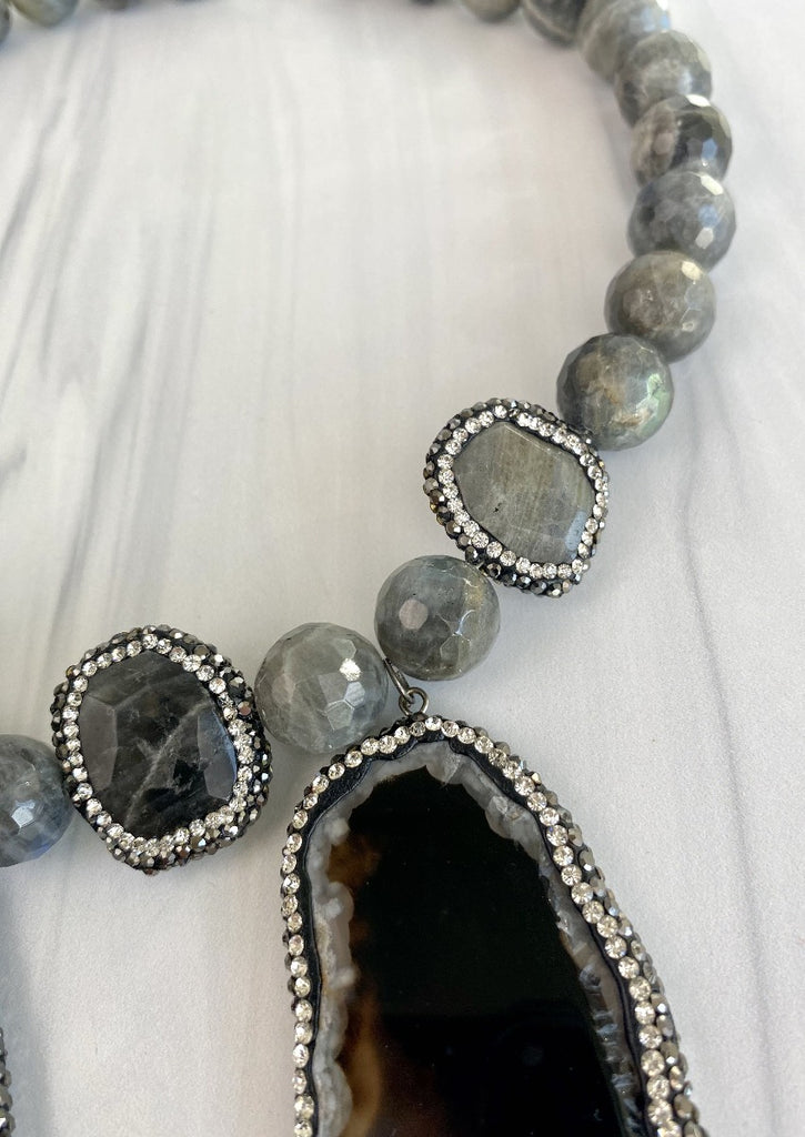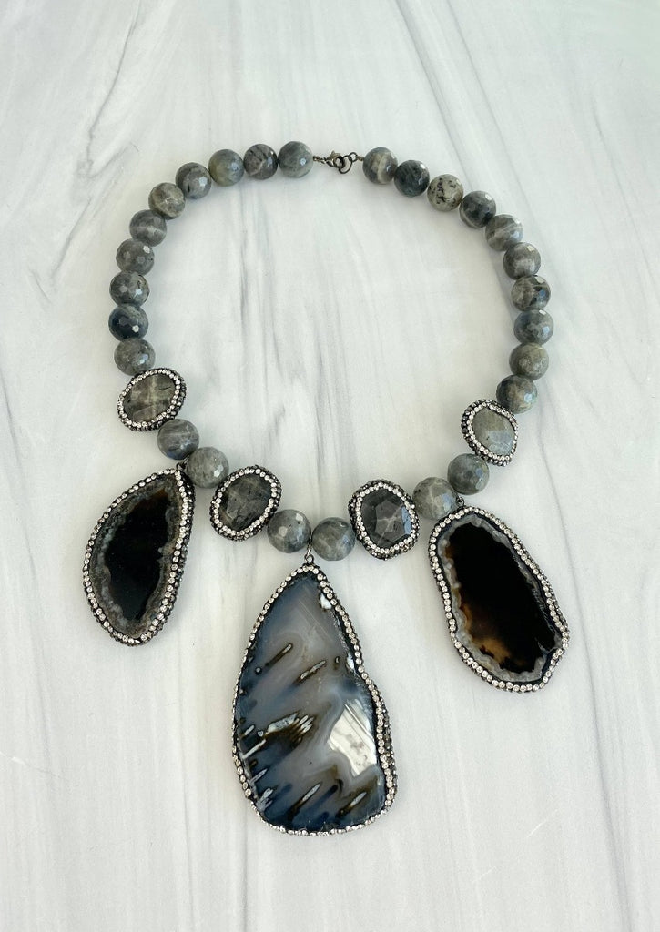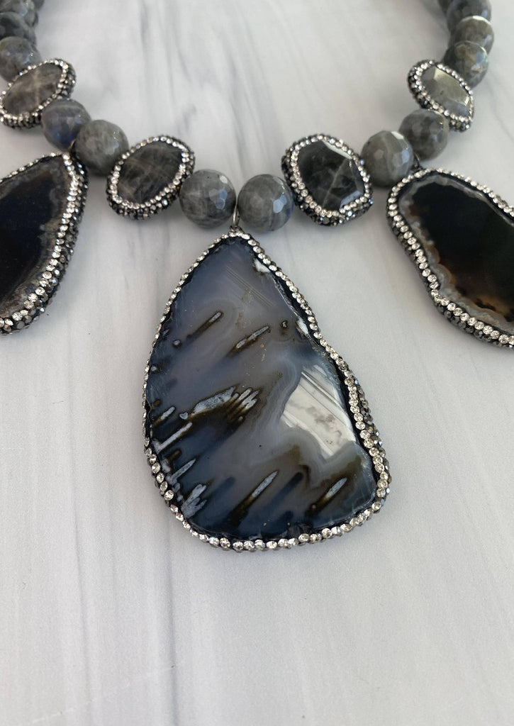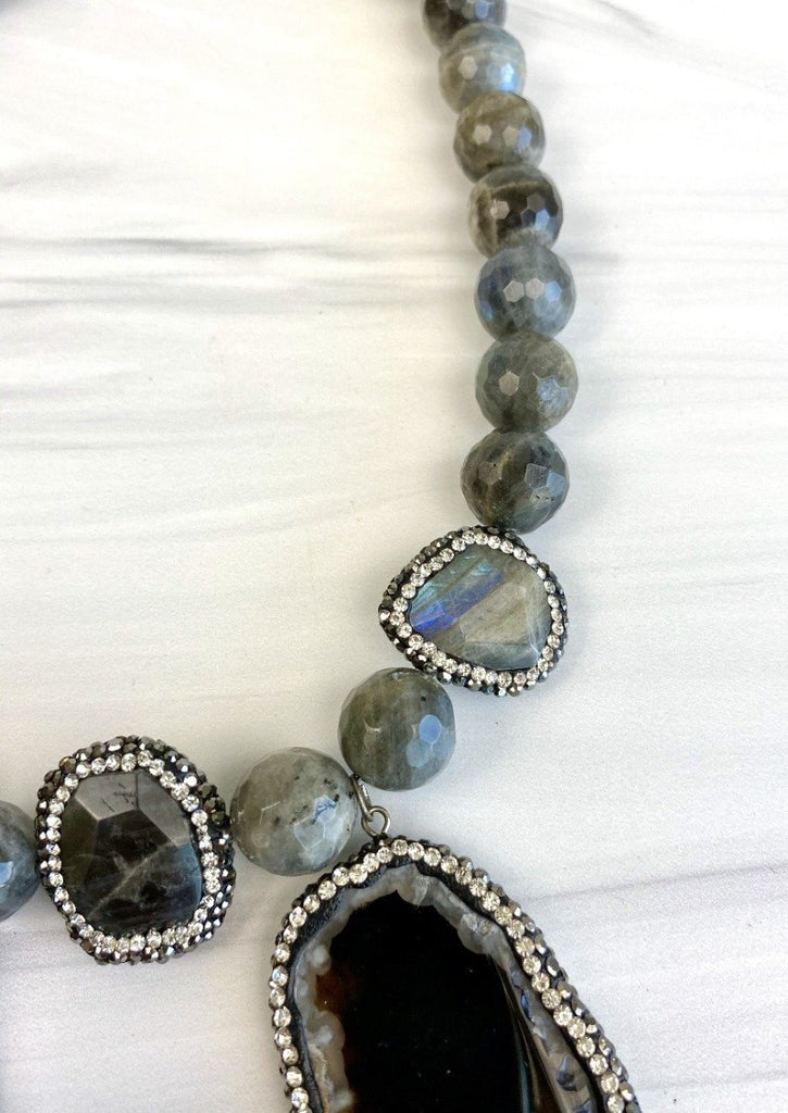 Statement Necklace Handmade Faceted Labradorite and Agate Slabs with Crystals. One of a kind, a truly discussion statement necklace that will turn heads. An absolute must to dress up any LBD.