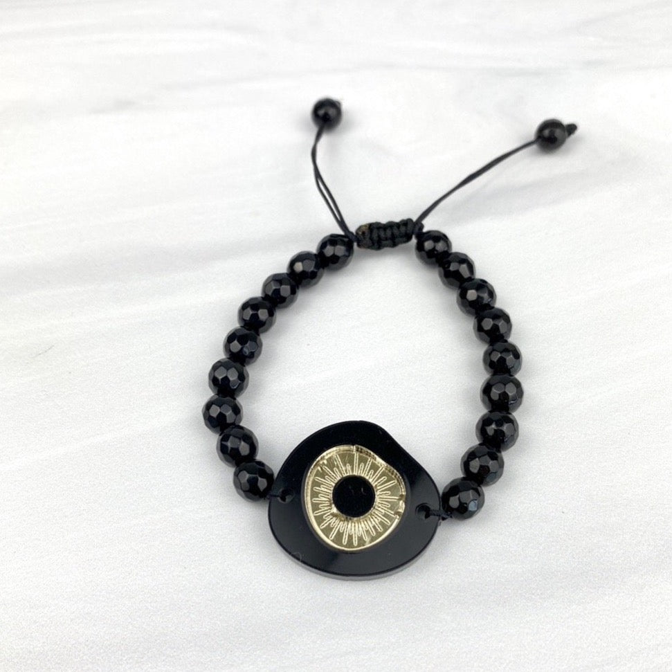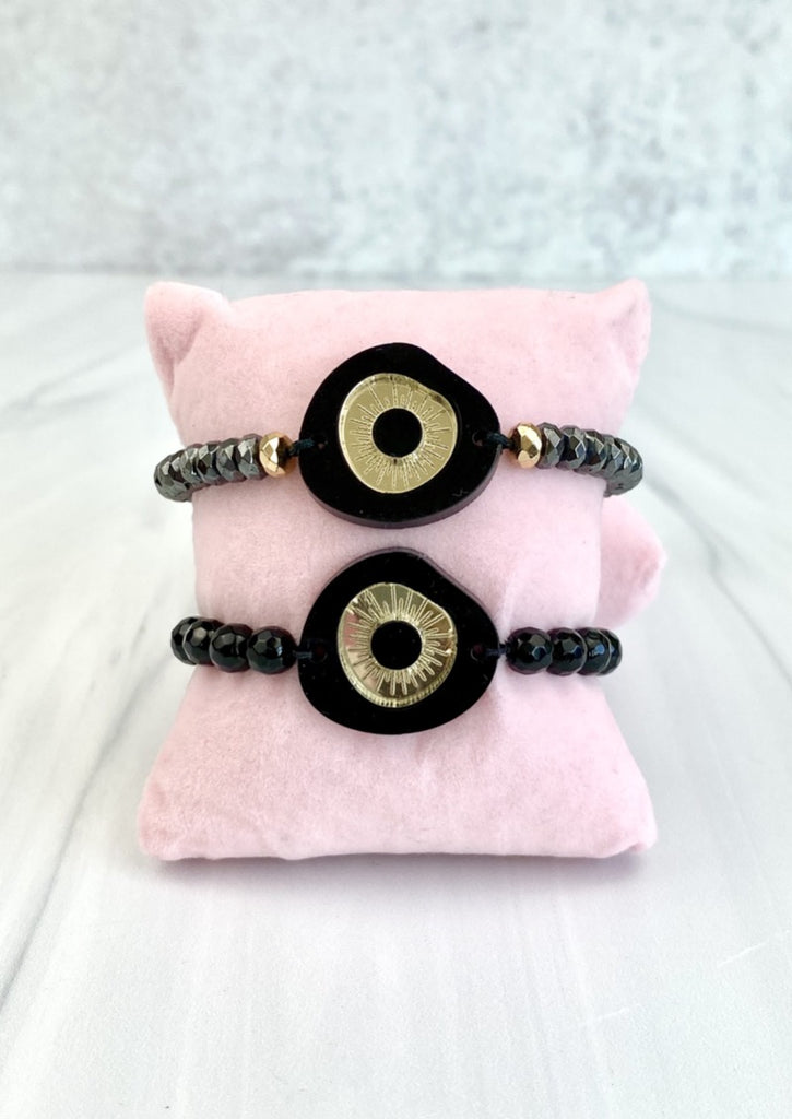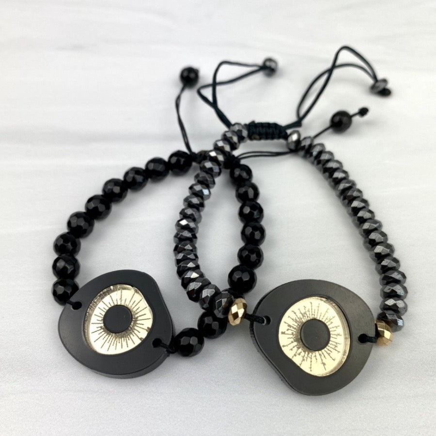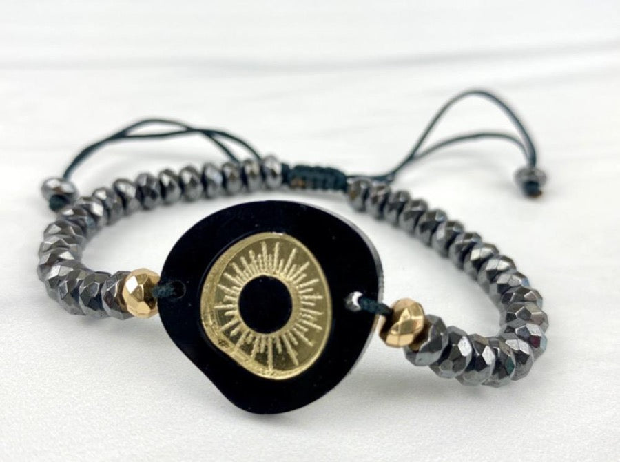 Evileye Acrylic Black Gold Motif Adjustable bracelet with Hematites Beads Joel Handmade