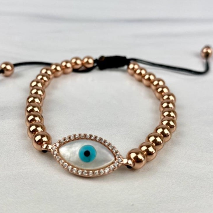 Evil-eye Mother of Pearl CZ Cubic Zirconia Embellished bracelets with Onyx, Stainless Steel Gold-plated Beads.