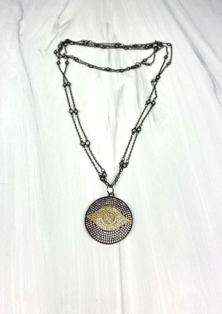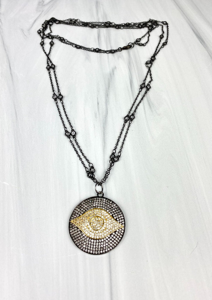 Evileye CZ Cubic Zirconia Necklace with Floating Diamonds CZ Gunmetal Black Double Chain Joel Handmade